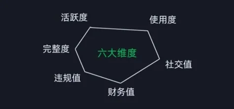 据经验,判定个人号的维度有六个:完整度、活跃度,使用度,社交值,财务值和违规值。